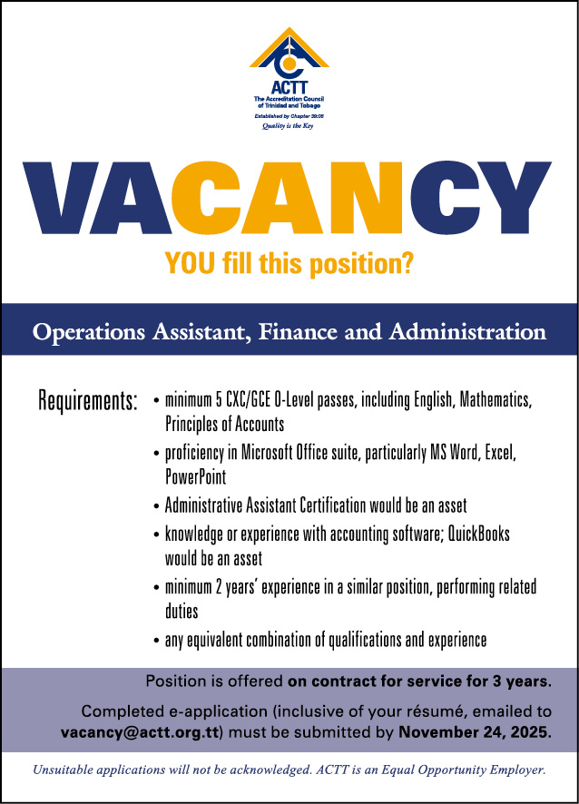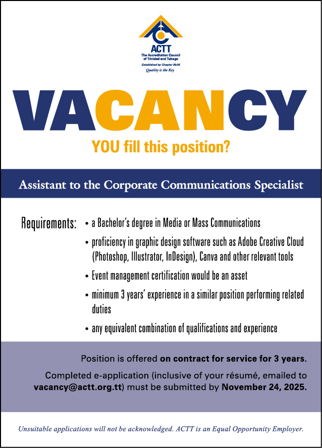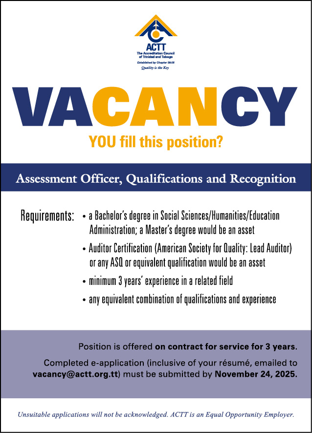 The Accreditation Council of Trinidad and Tobago (ACTT) is committed to employment of staff on the basis of the suitability of their qualifications, training, skills, competencies and experience. Whenever a vacancy arises, interested individuals are encouraged to view our website for details on the job specification to assess his/her fit for the job and thereafter apply.